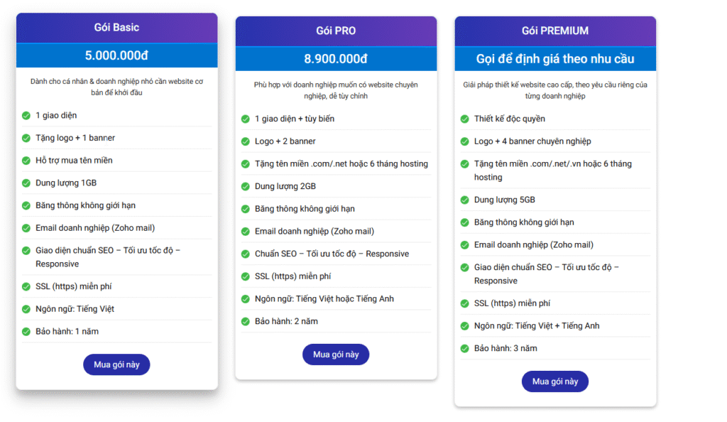 Mỗi gói dịch vụ được thiết kế để đáp ứng nhu cầu và ngân sách khác nhau của doanh nghiệp, từ khởi nghiệp đến các tập đoàn lớn.