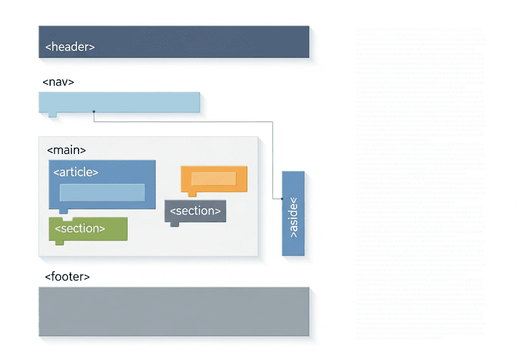 <header>: Báo hiệu đây là phần đầu trang, thường chứa logo và tiêu đề chính.<nav>: Báo hiệu đây là khu vực điều hướng chính của trang web. Google có thể sử dụng thông tin này để hiểu các liên kết quan trọng nhất.<main>: Báo hiệu đây là phần nội dung chính, độc nhất của trang này.<article>: Báo hiệu một mẩu nội dung độc lập, hoàn chỉnh (như một bài blog, một sản phẩm). Điều này giúp Google xác định đâu là nội dung cốt lõi để lập chỉ mục.<aside>: Báo hiệu nội dung phụ, liên quan bên lề (như sidebar).<footer>: Báo hiệu đây là chân trang, thường chứa thông tin liên hệ, bản quyền.