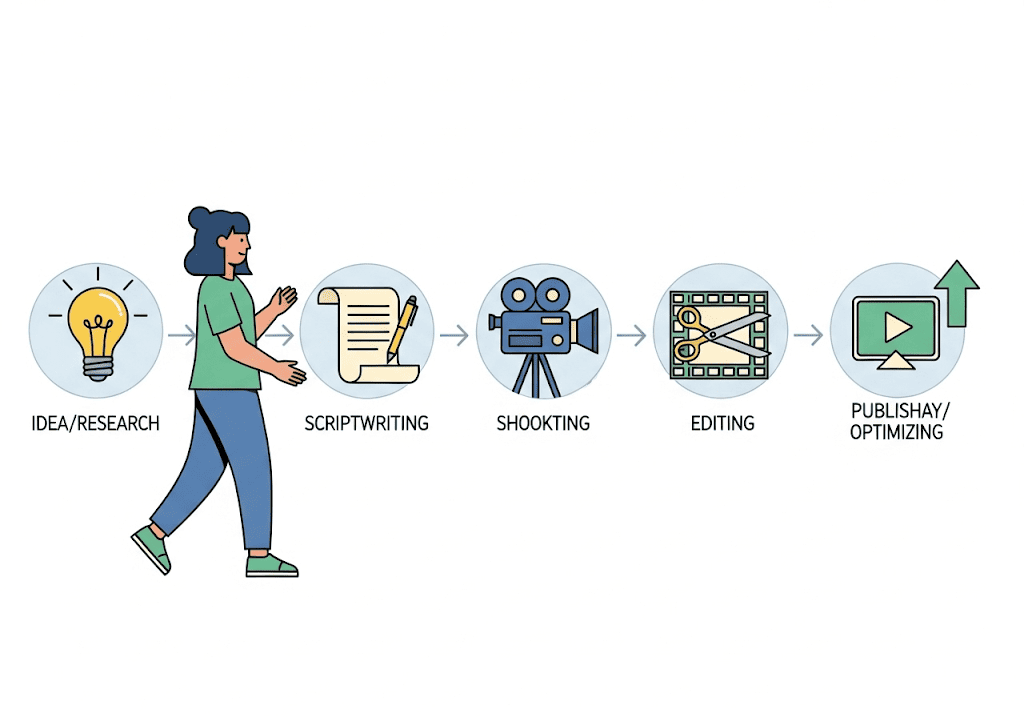 Quy trình này gồm 5 bước rõ ràng: Lên ý tưởng, viết kịch bản, quay phim, chỉnh sửa và cuối cùng là tối ưu để đăng tải. Việc tuân thủ một quy trình sản xuất video có cấu trúc sẽ giúp bạn tiết kiệm thời gian, tránh được những sai lầm phổ biến và tạo ra sản phẩm cuối cùng chỉn chu, chuyên nghiệp hơn ngay từ những video đầu tiên.