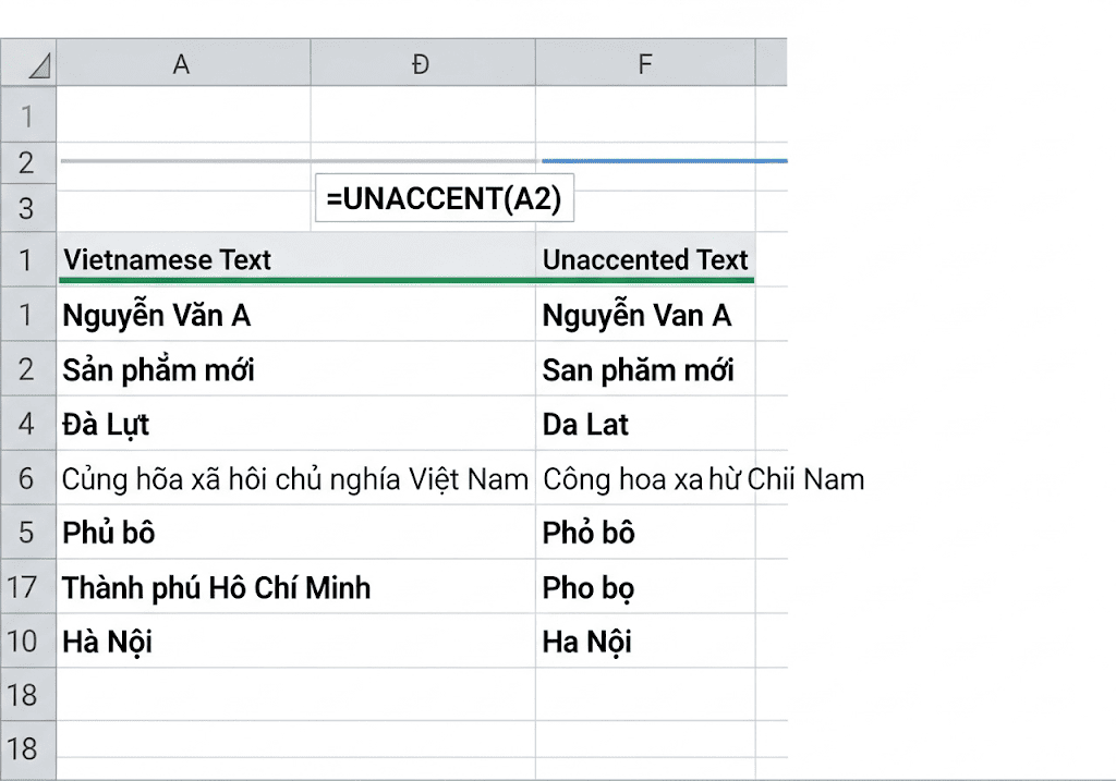 Hướng dẫn chuyển chữ có dấu sang không dấu bằng Excel và Google Sheets