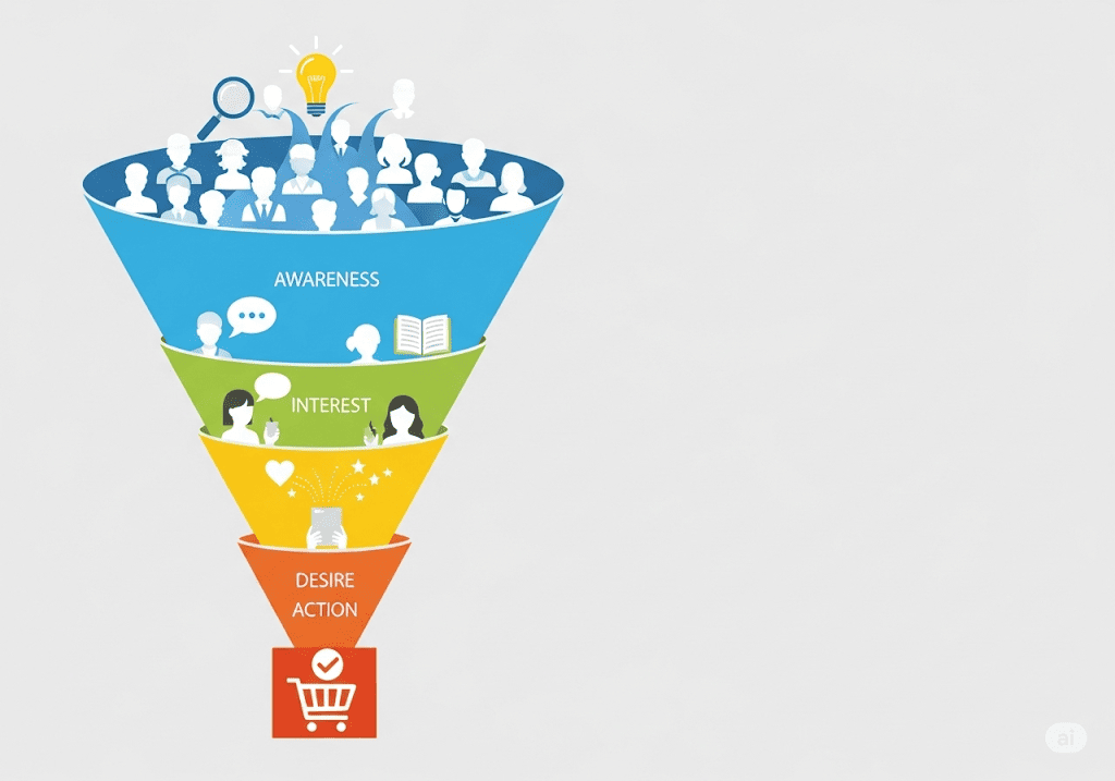 Để dẫn dắt khách truy cập một cách có hệ thống, bạn cần xây dựng chiến lược bán hàng hiệu quả, trong đó việc xây dựng một phễu chuyển đổi (conversion funnel) là rất quan trọng. Đây là quy trình vạch ra hành trình khách hàng qua bốn giai đoạn cốt lõi theo mô hình AIDA: Nhận biết (Awareness), Thích thú (Interest), Mong muốn (Desire), và Hành động (Action). Việc áp dụng mô hình này giúp bạn cấu trúc nội dung và các điểm chạm trên website một cách logic, từ đó nuôi dưỡng khách hàng tiềm năng (lead nurturing) và thúc đẩy họ tiến đến quyết định mua hàng cuối cùng.