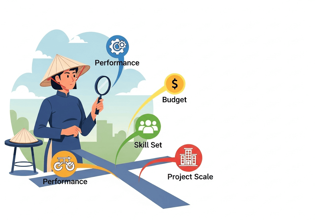 - Nếu bạn có một đội ngũ: Hãy ưu tiên công nghệ mà team của bạn đã có kinh nghiệm. Việc này giúp giảm đáng kể thời gian phát triển, chi phí đào tạo và rủi ro gặp phải các vấn đề khó giải quyết.