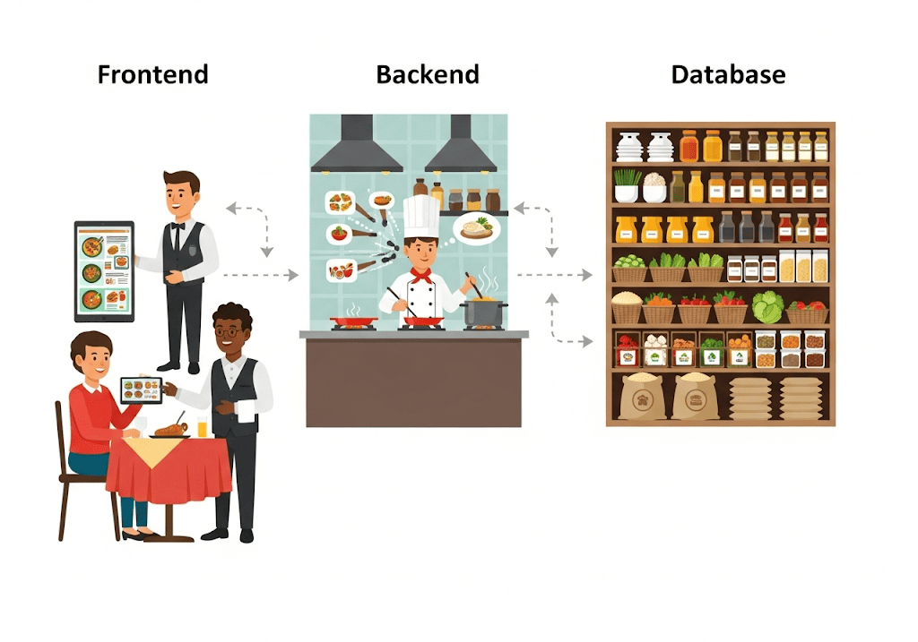 Để hiểu cách một website vận hành, hãy tưởng tượng nó như một nhà hàng sang trọng. Frontend chính là toàn bộ không gian phục vụ mà bạn thấy: từ cách bài trí bàn ghế, menu đẹp mắt, đến thái độ của nhân viên phục vụ. Backend là “căn bếp” ẩn sau, nơi đầu bếp nhận yêu cầu, chế biến món ăn và quản lý mọi thứ. Cuối cùng, Database chính là “kho hàng”, nơi lưu trữ tất cả nguyên liệu. Hiểu rõ ba thành phần này là bước đầu tiên và quan trọng nhất để giải mã thế giới phát triển web.