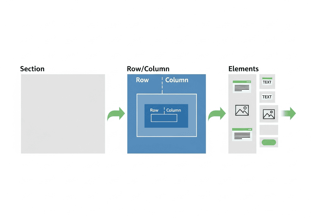 Tại sao phải dùng Row/Column? Đây là bước quan trọng nhất để sắp xếp nội dung một cách khoa học. Bỏ qua bước này và thêm thẳng Element vào Section sẽ khiến bạn không thể chia cột và kiểm soát layout.
