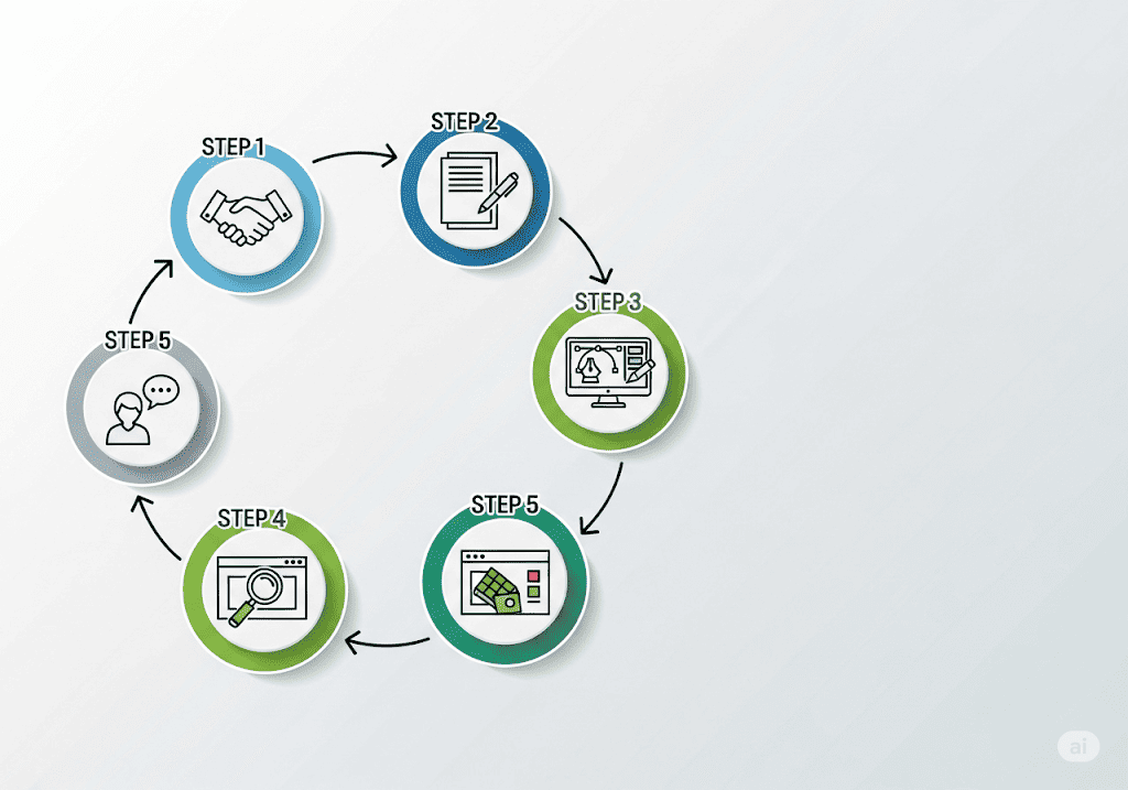 Để đạt được những kết quả ấn tượng như các dự án đã thực hiện tại Đà Nẵng, chúng tôi áp dụng một quy trình thiết kế web gồm 5 bước được chuẩn hóa, tập trung vào sự minh bạch và hiệu quả. Quy trình này được xây dựng để loại bỏ mọi sự mập mờ, giúp bạn hoàn toàn kiểm soát tiến độ, chất lượng và ngân sách, đảm bảo không có chi phí ẩn nào phát sinh.