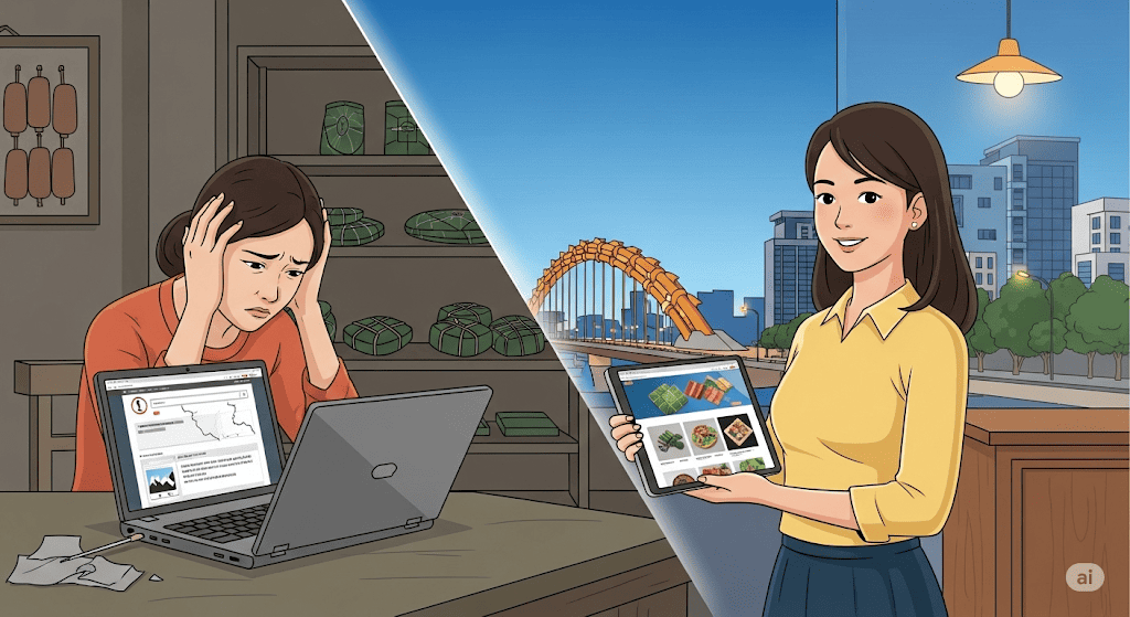 - Thách thức: Cửa hàng “Đặc sản Mẹ Tôi” là một địa chỉ quen thuộc tại Đà Nẵng, chuyên bán các loại mắm và đặc sản miền Trung. Trước đây, họ chủ yếu bán hàng cho khách quen và khách du lịch ghé qua trực tiếp. Kênh online duy nhất là trang Facebook cá nhân, việc chốt đơn thủ công qua tin nhắn và điện thoại thường xuyên quá tải và sai sót, đặc biệt vào mùa du lịch cao điểm. Họ muốn mở rộng kinh doanh ra toàn quốc nhưng không biết bắt đầu từ đâu.
