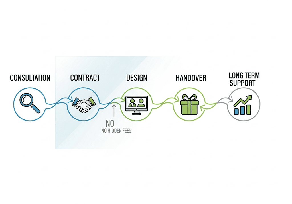 Toàn bộ các hạng mục công việc, chi phí và thời gian đều được thể hiện chi tiết trong hợp đồng thiết kế website ngay từ đầu, mang lại sự an tâm tuyệt đối cho bạn.