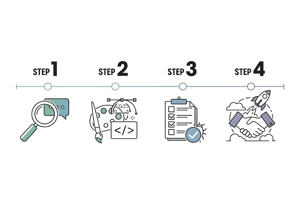 Sau khi đã bị thuyết phục bởi những lợi ích và giải pháp vượt trội mà một website chuyên nghiệp mang lại, bạn chắc chắn sẽ muốn biết “làm việc với Tini Tech sẽ cụ thể ra sao?”. Lộ trình 4 bước dưới đây sẽ trả lời câu hỏi đó một cách rõ ràng nhất.