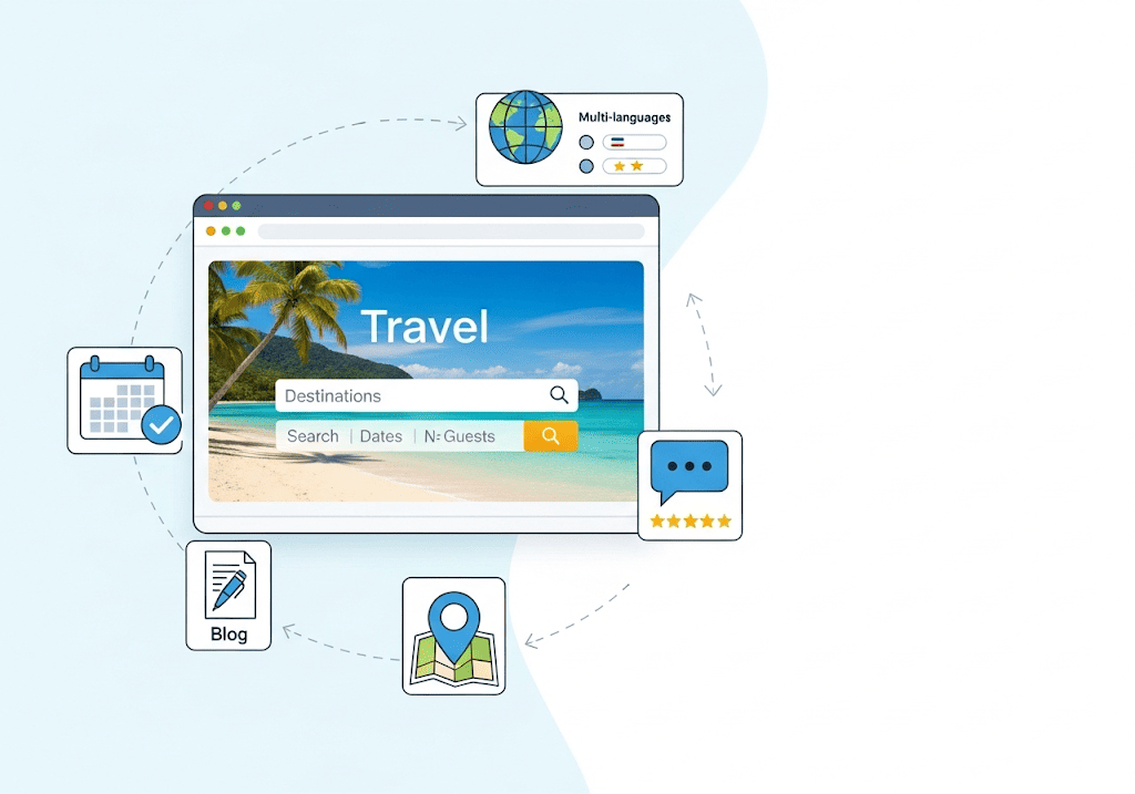Một website du lịch hiệu quả không chỉ là một brochure online đẹp mắt, mà phải là một cỗ máy bán hàng 24/7. Để làm được điều đó, nó cần tích hợp các tính năng website du lịch cốt lõi như hệ thống đặt tour/phòng (Booking Engine) liền mạch, cổng thanh toán trực tuyến an toàn, và khả năng quản lý tour/dịch vụ linh hoạt. Thiếu những yếu tố này, website của bạn chỉ dừng lại ở mức “trưng bày” thay vì “chuyển đổi” khách hàng tiềm năng thành doanh thu thực tế.